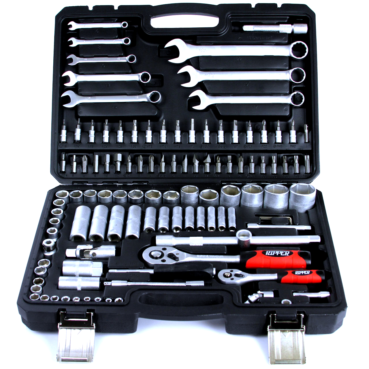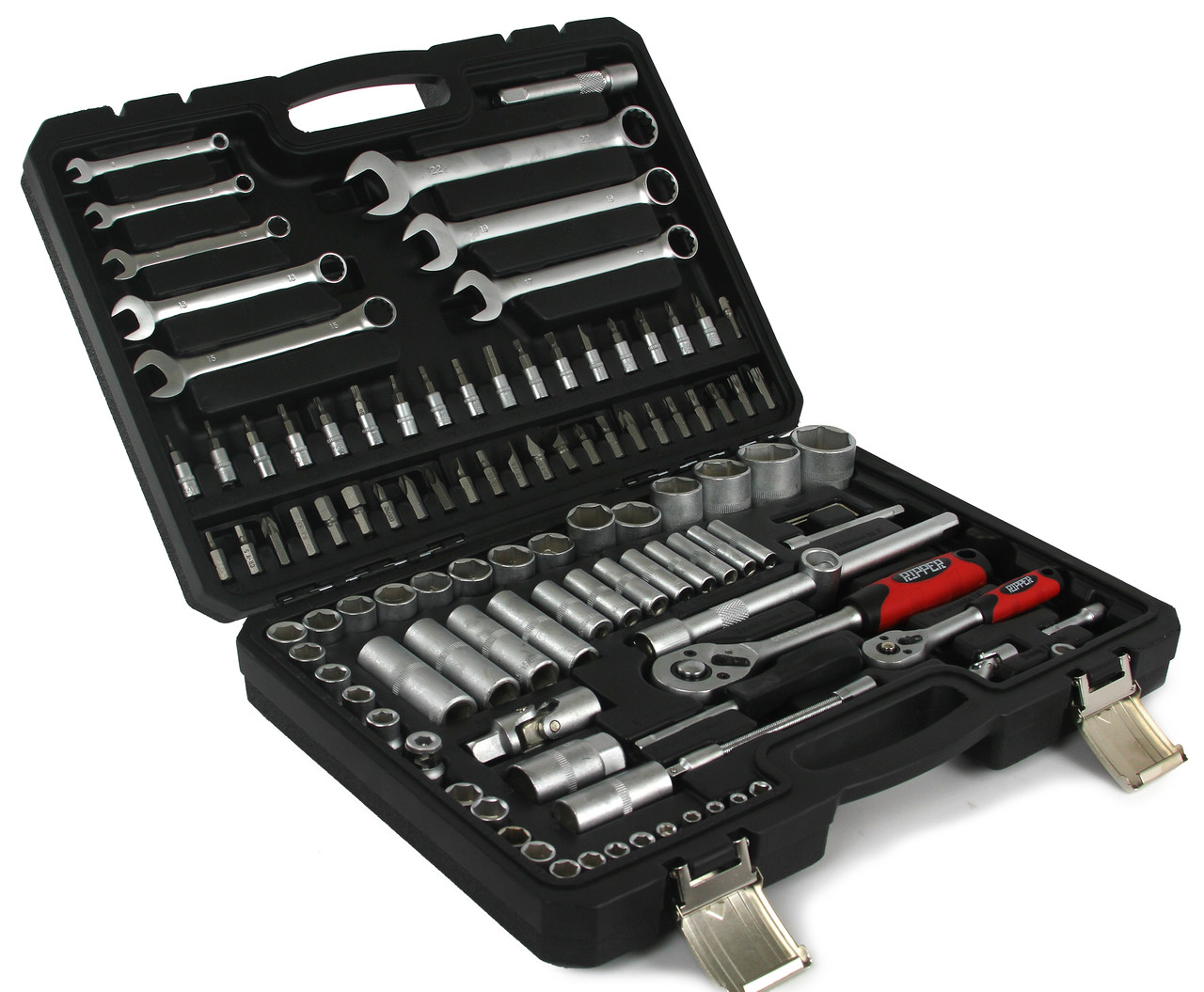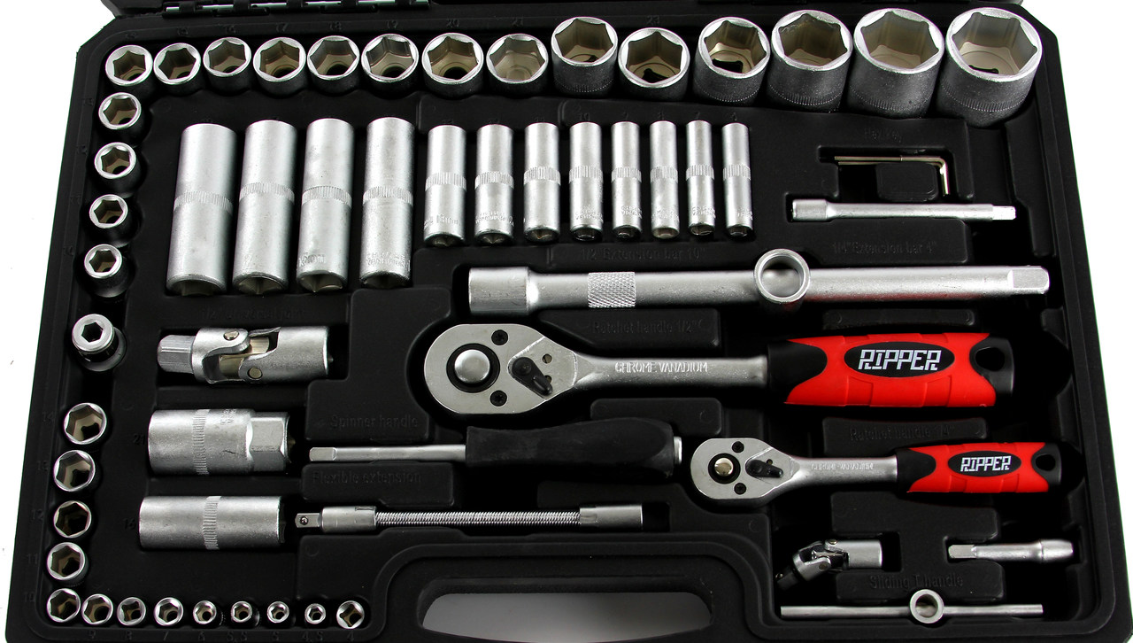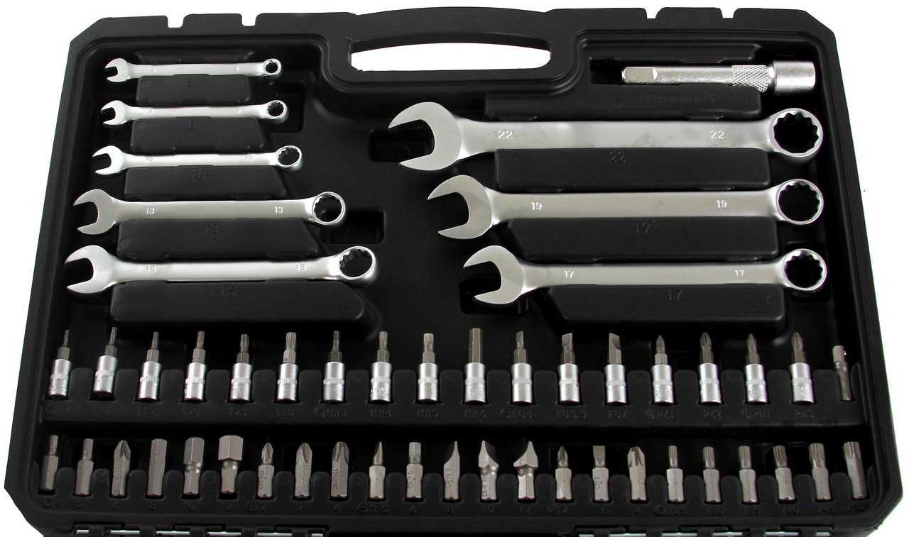 Súprava obsahuje nástrčné hlavice 1/4" a 1/2", račne, očkoploché kľúče, bity, predlžováky a kĺbové adaptéry. Všetko je prehľadne uložené v praktickom mäkkom prenášacom puzdre, ktoré uľahčuje skladovanie aj prenášanie.