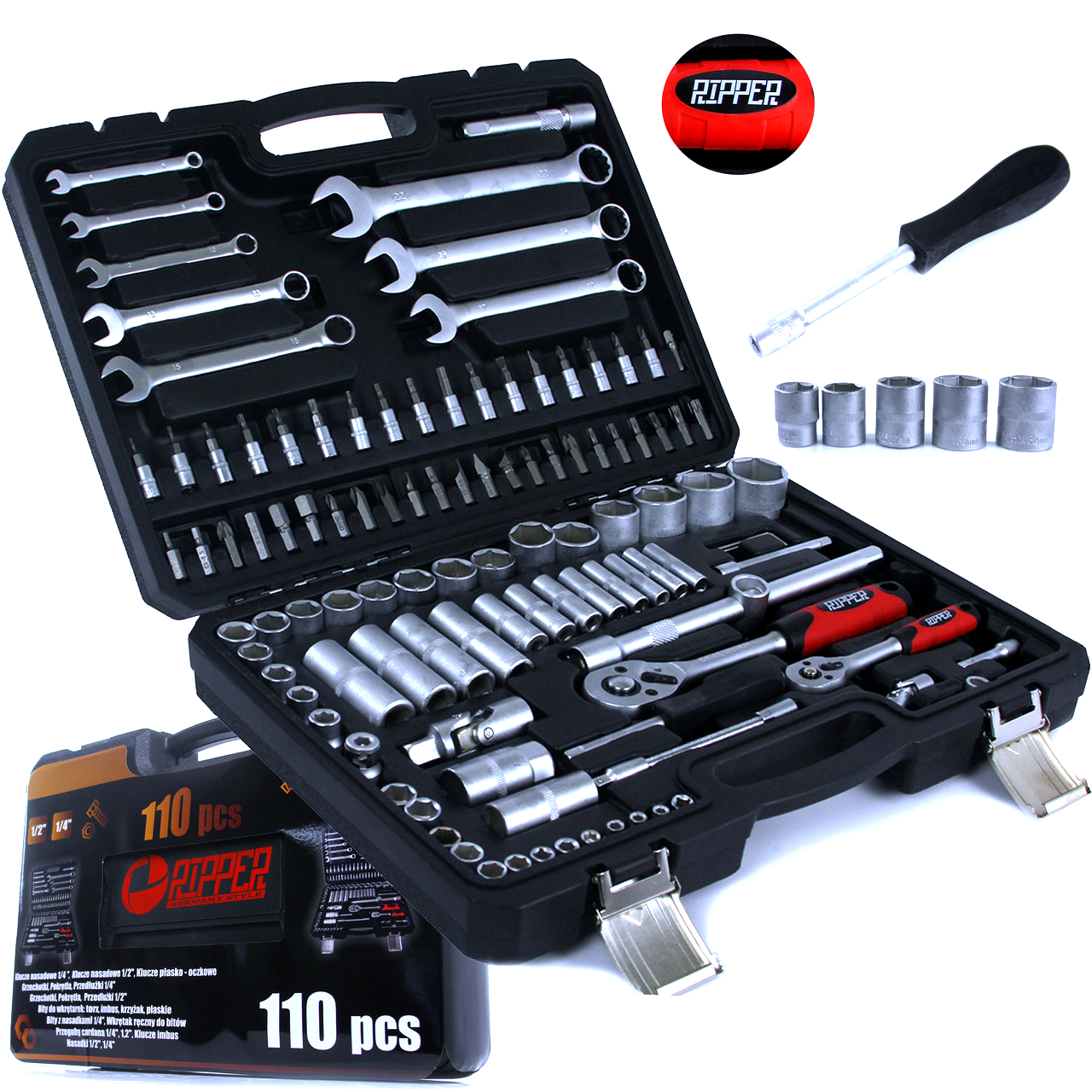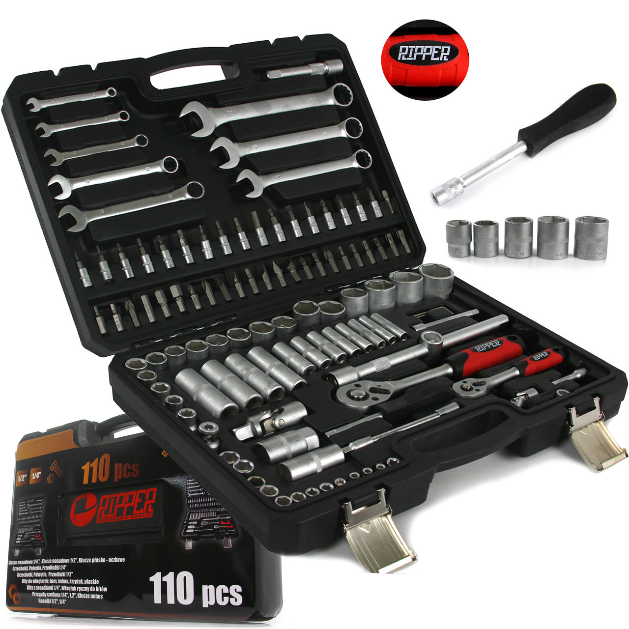 🔹 Veľkosti kľúčov: 1/4", 1/2", očkoploché 6–22 mm