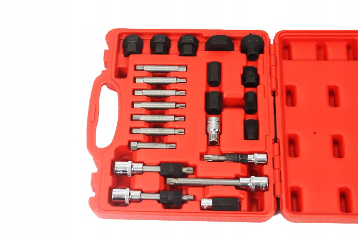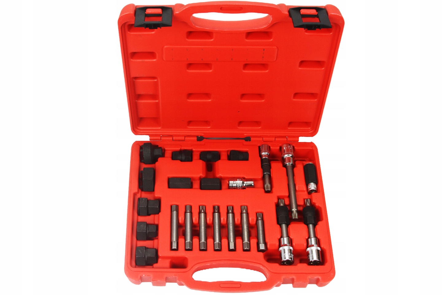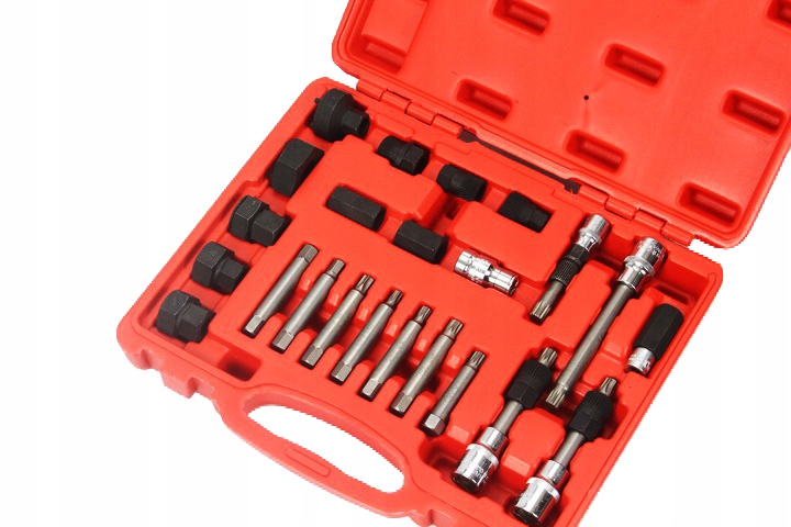 Špeciálna sada 24 kusov kľúčov na montáž a demontáž alternátorov so spojkou, kompatibilná s typmi Bosch a Magneti Marelli. Vyrobená z kvalitnej CrV ocele, vhodná na opravy vozidiel rôznych značiek. Sada obsahuje rôzne nástavce a nástroje na jednoduchú a bezpečnú manipuláciu s alternátormi.