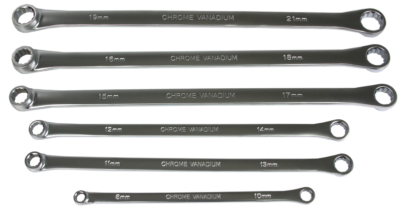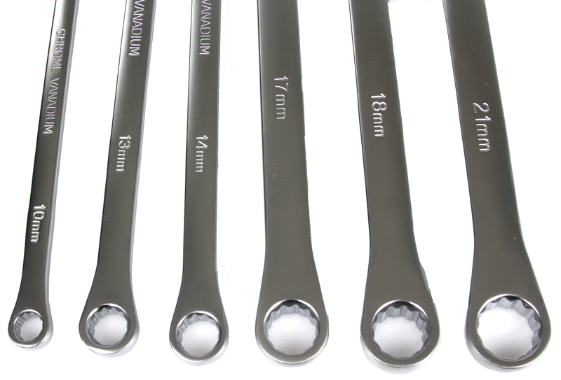 📦 6-dielna sada predĺžených očkových vidlicových kľúčov v rozmedzí od 8 mm do 21 mm.