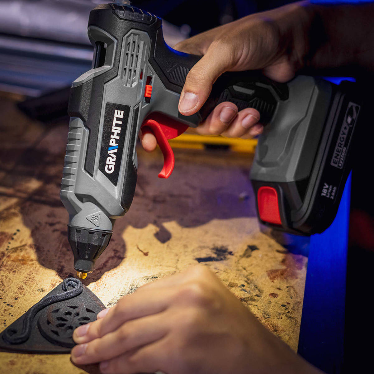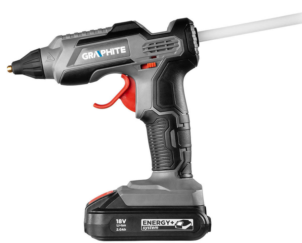 GRAPHITE Energy+ 58G040 je výkonná akumulátorová tavná lepiaca pištoľ, ktorá umožňuje rýchle a precízne lepenie rôznych materiálov vrátane papiera, kože, textílií, plastov, dreva, kovu, korku, kameňa a lepenky.