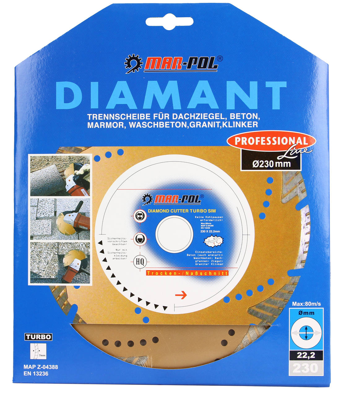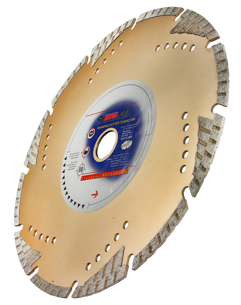 Diamantový kotúč MAR-POL M08725 LASER GC je profesionálny rezný kotúč určený na spracovanie stavebných materiálov, ako sú betón, tehla, dlažobné kocky, klinker, pórobetón a keramické dlaždice. Laserom zvárané segmenty zaručujú vysokú kvalitu, presnosť a dlhú životnosť. Kotúč je ideálny na hlboké rezy do tvrdých a stredne tvrdých materiálov. Určený na prácu nasucho s uhlovými brúskami, dosahuje maximálnu lineárnu rýchlosť 80 m/s a je vhodný na profesionálne použitie.