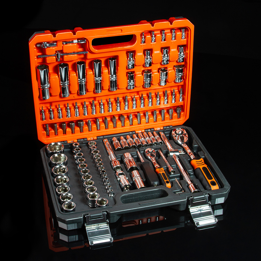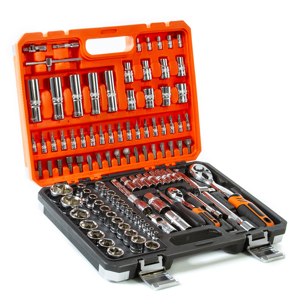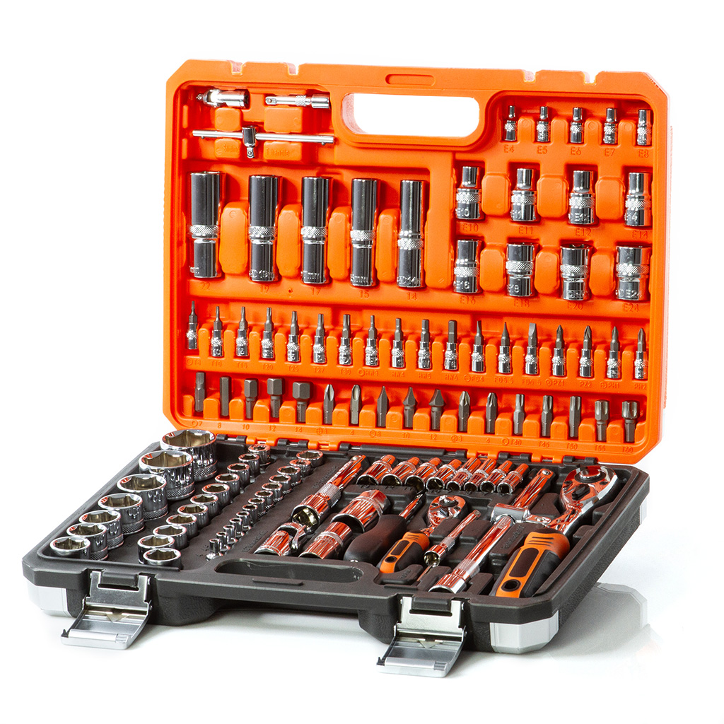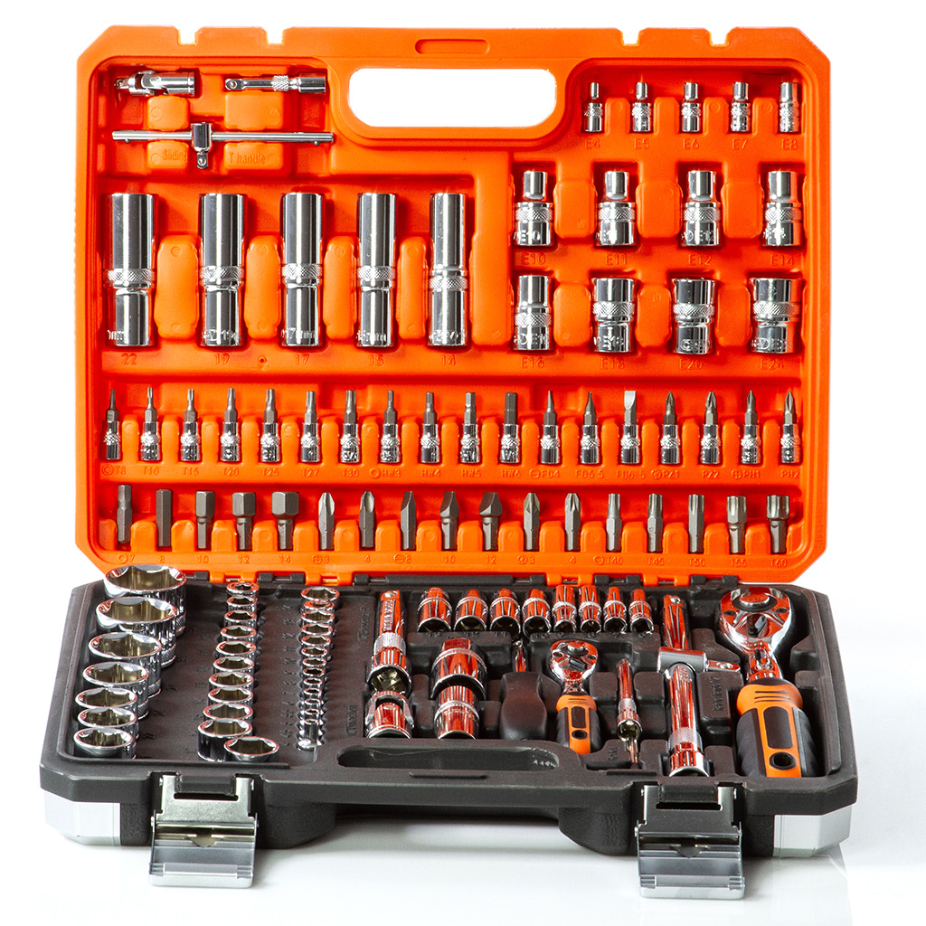 Sada kľúčov BJC B58228 (108 dielov) obsahuje všetko potrebné pre opravy a montážne práce v dielni, autoservise alebo domácnosti. Vyrobená z zosilnenej chróm-vanádiovej ocele (CrV) s prímesou chrómu a vanádu, zaručuje vysokú odolnosť proti oderu a vysokému zaťaženiu.