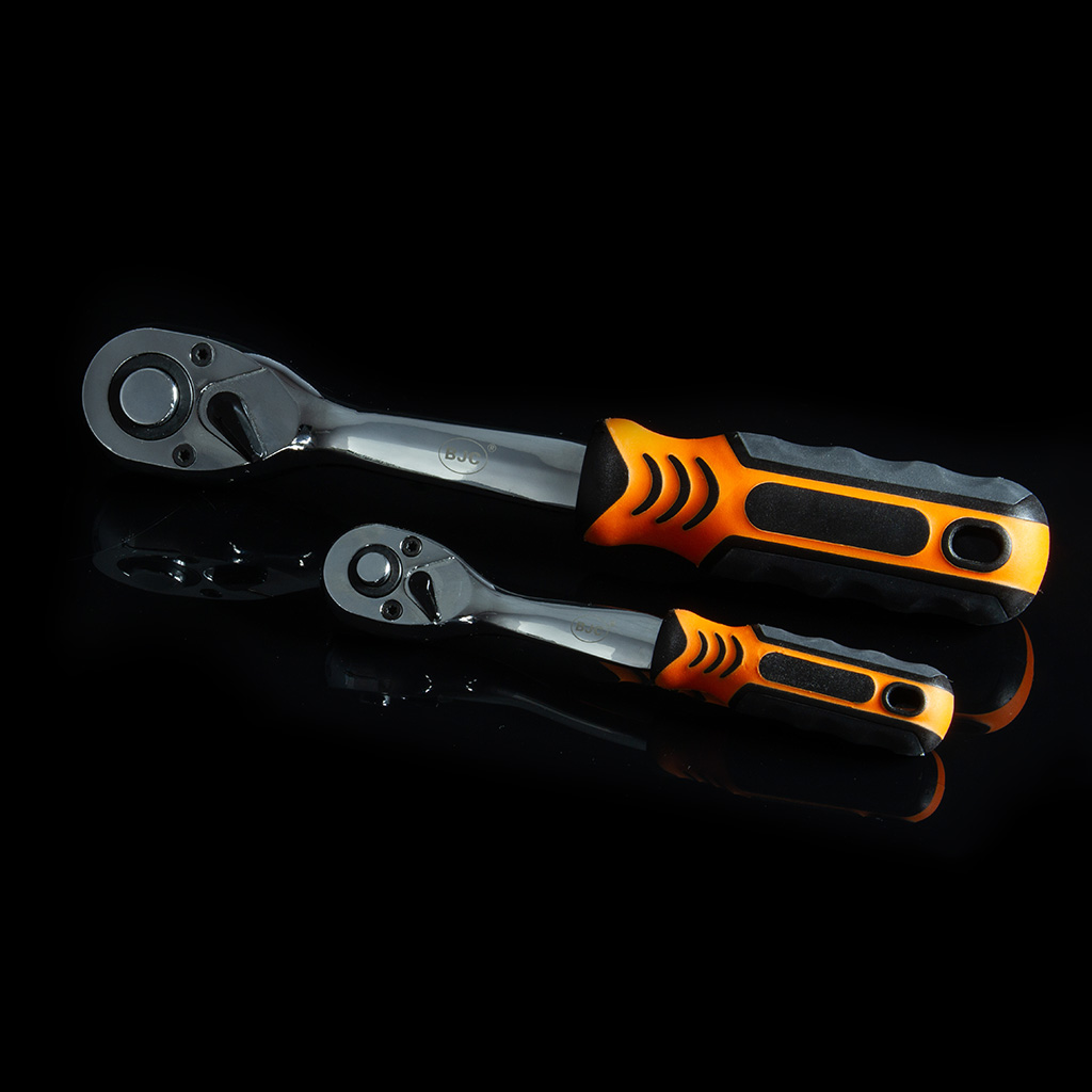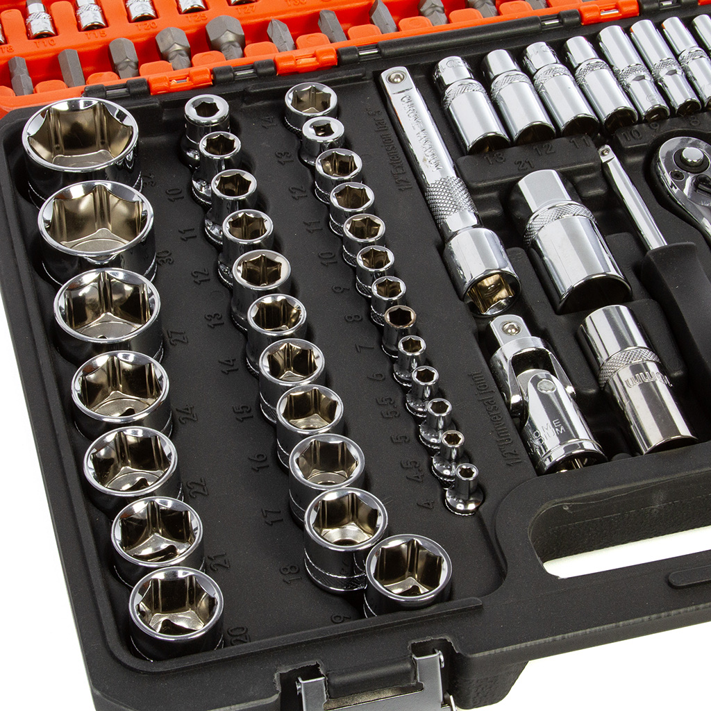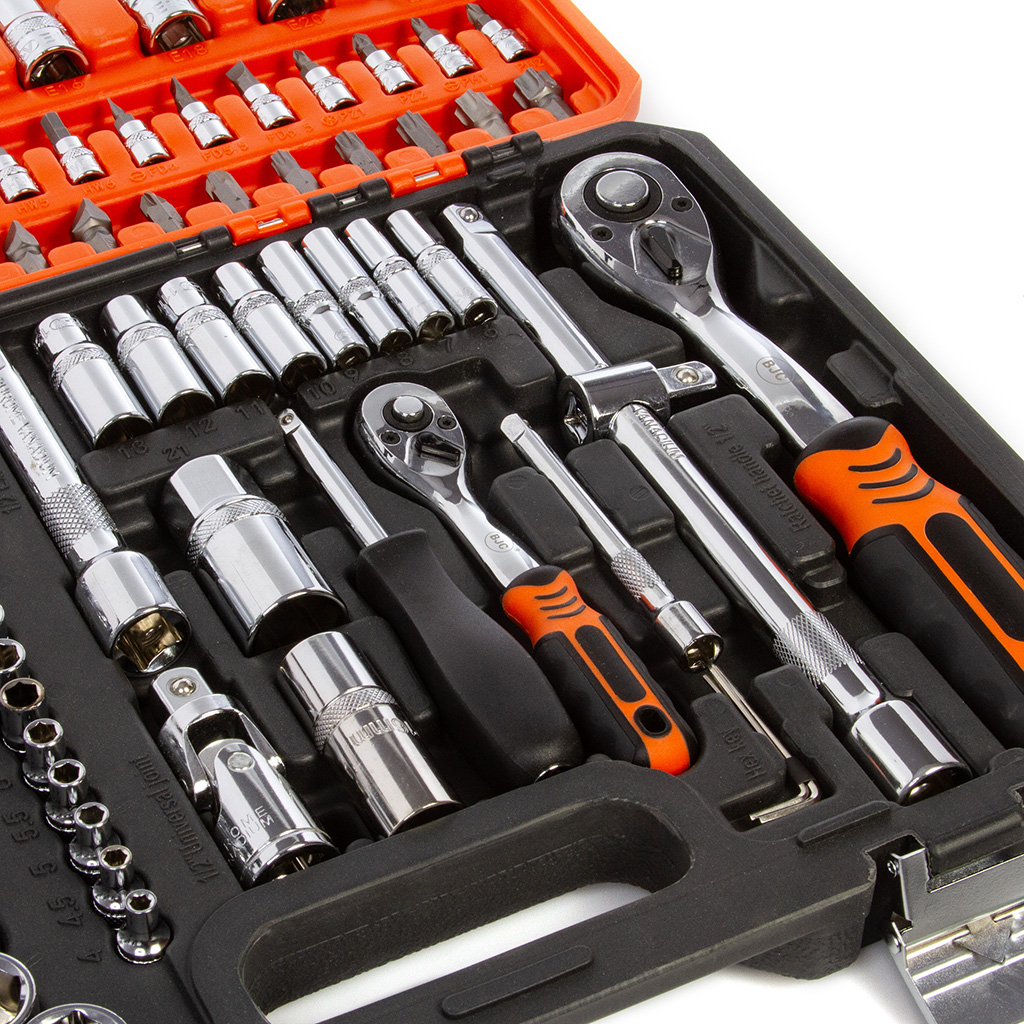 Súprava obsahuje rôzne typy nástavcov, račňových kľúčov, bitov a príslušenstva, ktoré pokrývajú široké spektrum použitia. Račne sú vybavené ergonomickou protišmykovou rukoväťou pre pohodlné a bezpečné používanie.