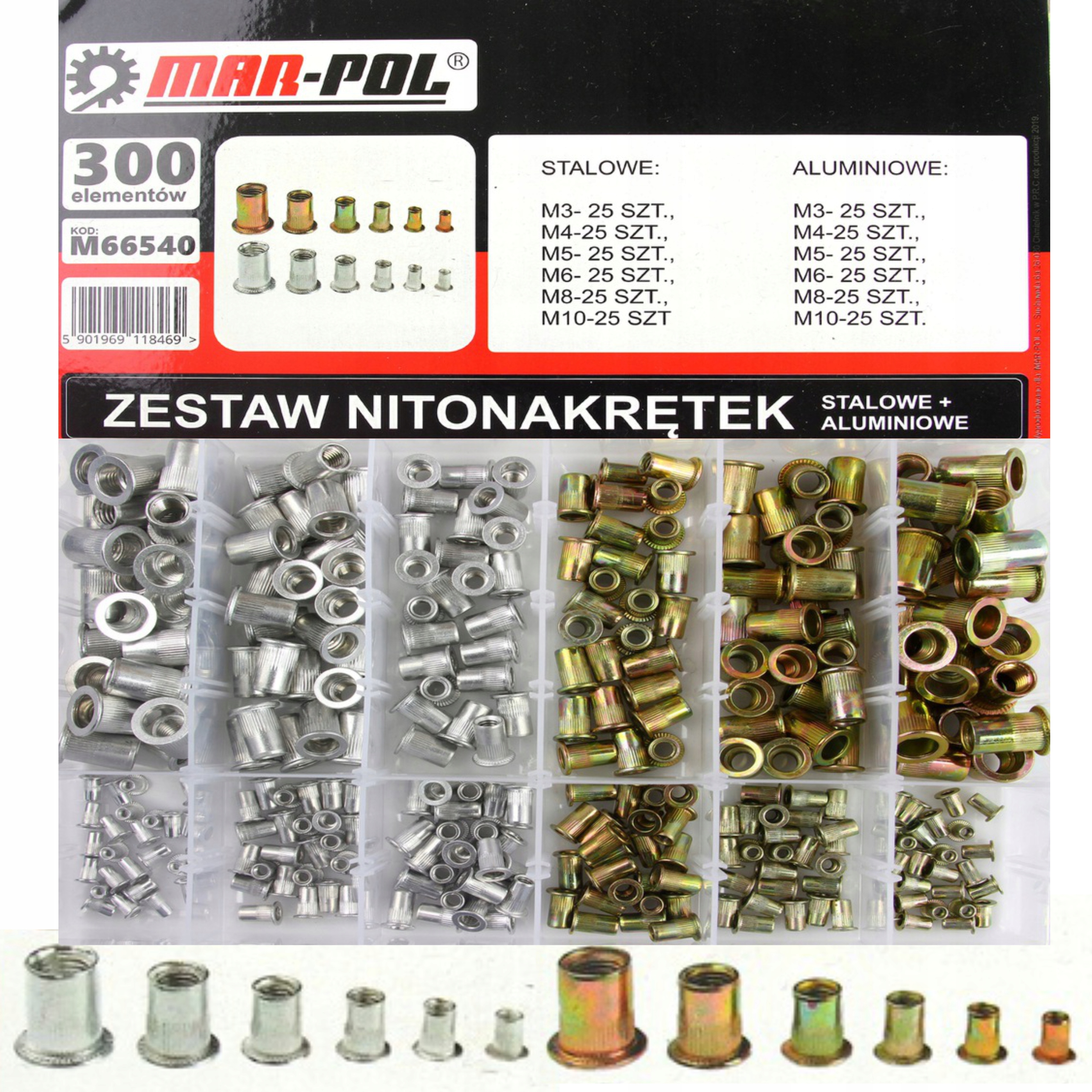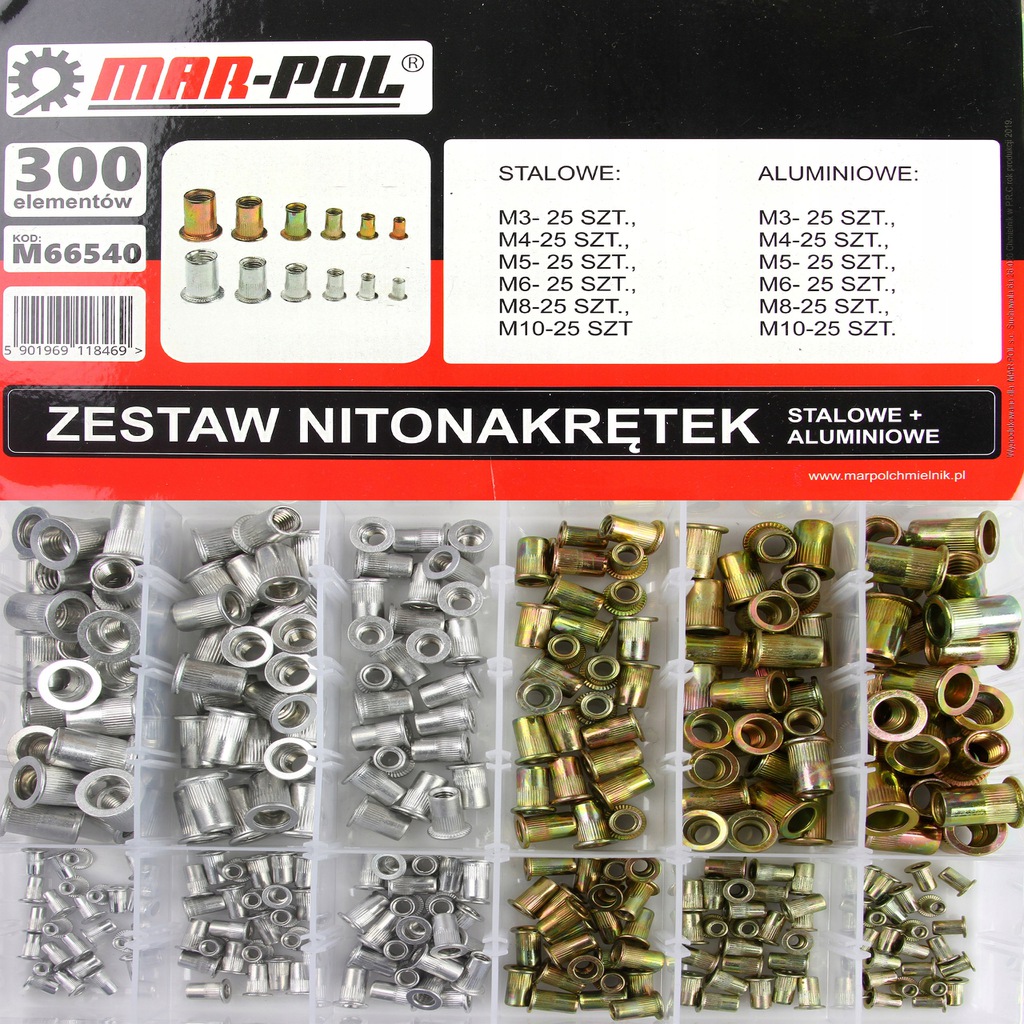 Sada MAR-POL M66540 obsahuje 300 kusov nitovacích matíc v rôznych veľkostiach M3 – M10, vyrobených z hliníka a ocele. Tieto matice sú navrhnuté na vytvorenie pevného závitového spoja v tenkých materiáloch, ako sú plechy, profily a rúrky, kde nie je možné použiť bežné závitové spoje.