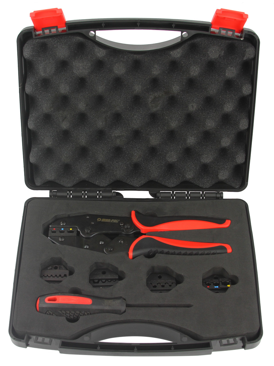 Sada obsahuje 5 vymeniteľných matríc, ktoré umožňujú lisovanie rôznych druhov konektorov. Krimpovacie kliešte majú nastaviteľný račňový mechanizmus, ktorý zabezpečuje rovnomerný tlak pri lisovaní. Ergonomická rukoväť umožňuje pohodlné a presné ovládanie pri práci.