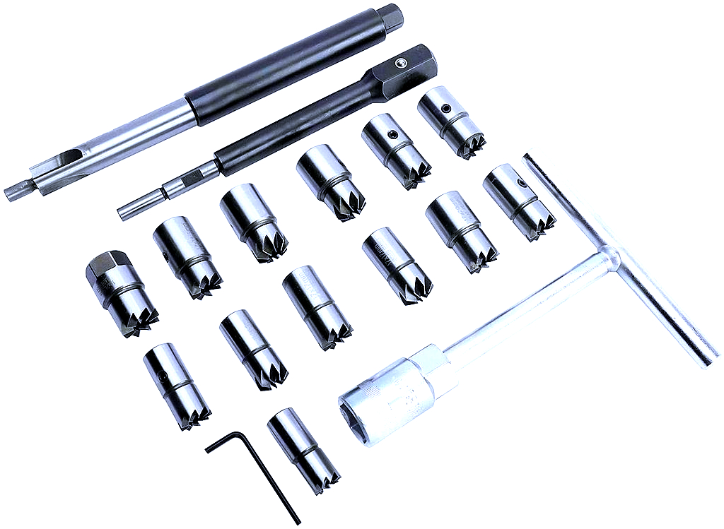 Súprava obsahuje pravouhlé aj ploché frézy rôznych rozmerov, ktoré umožňujú detailnú úpravu sediel vstrekovačov podľa špecifikácií výrobcu. Frézy sú vyrobené z kvalitnej ocele, čo zaručuje ich dlhú životnosť a presnosť opráv.