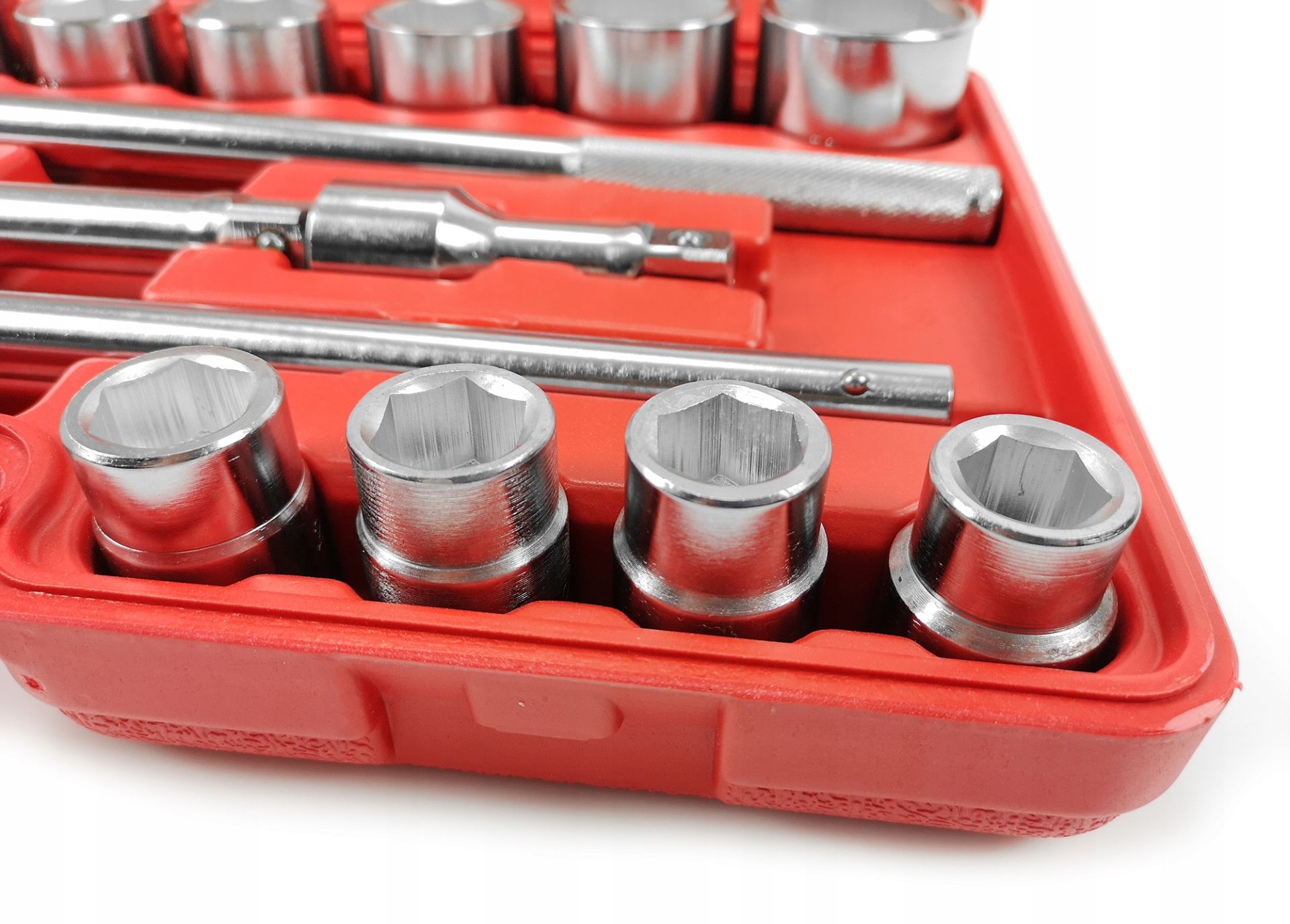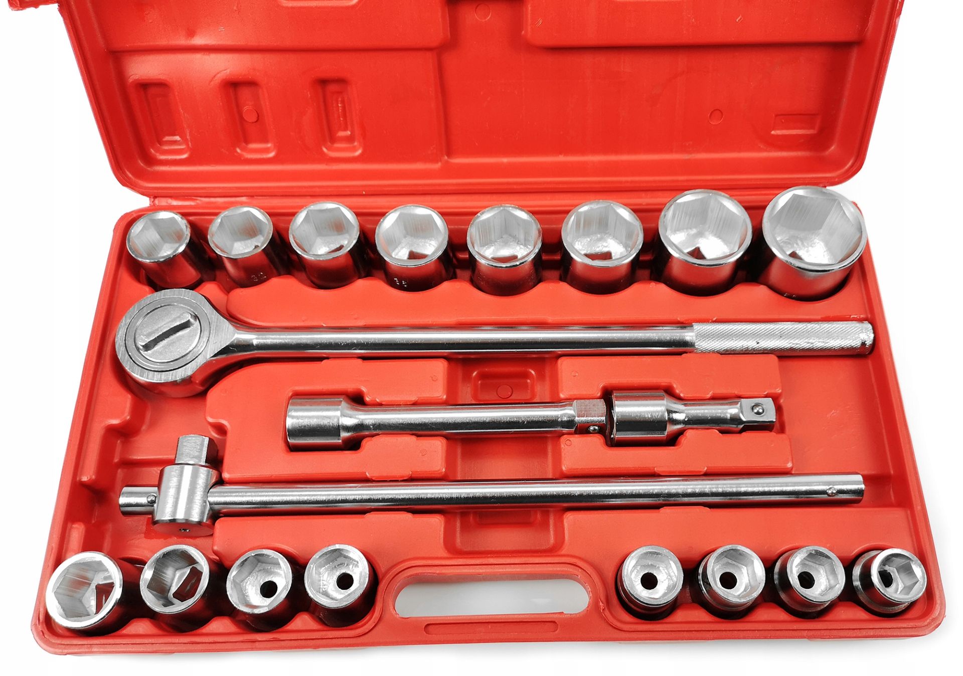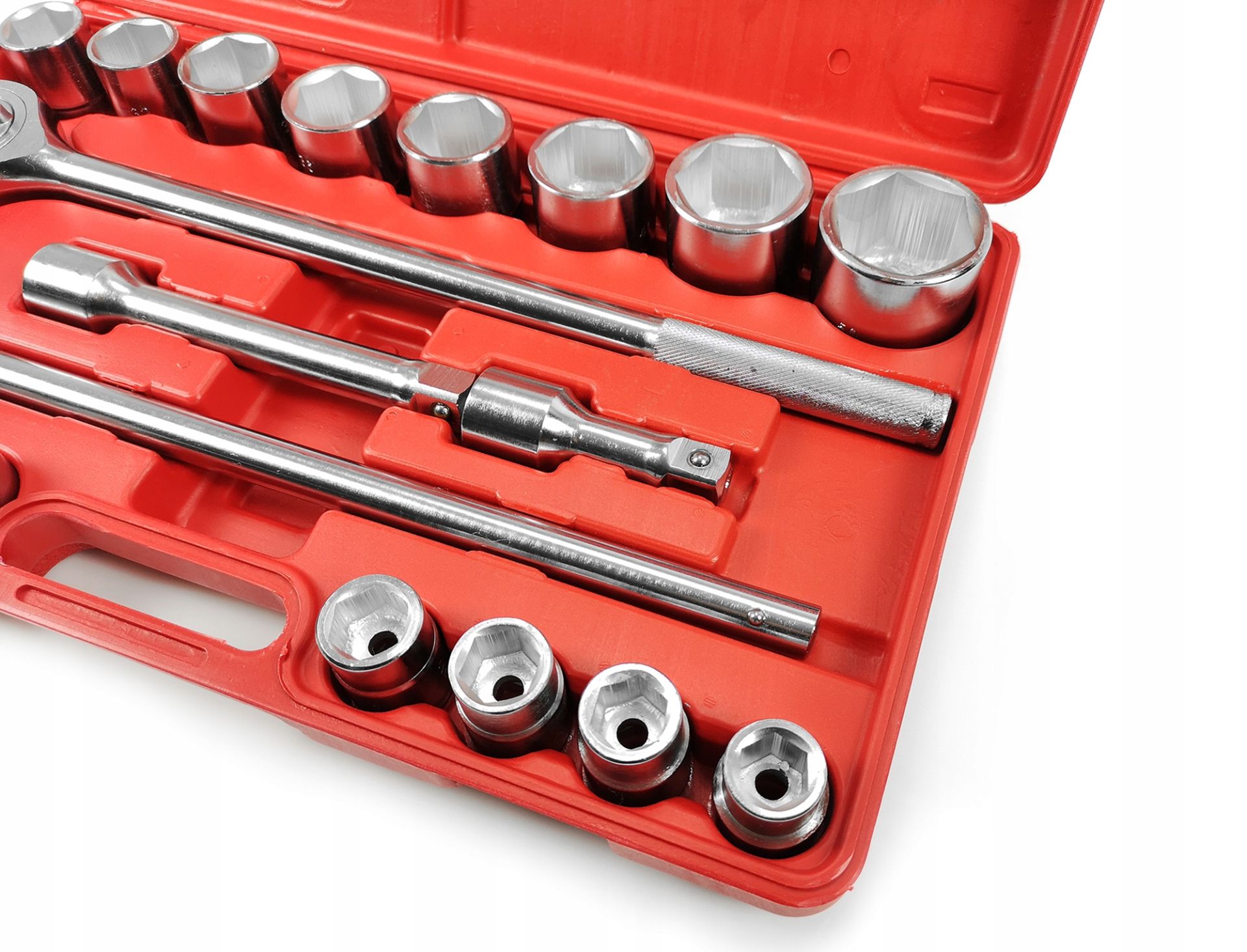 Súprava obsahuje okrem kľúčov aj račňu 3/4", predlžováky a trhák. Všetky komponenty sú usporiadané v praktickom plastovom kufríku, ktorý umožňuje jednoduché prenášanie a organizáciu nástrojov.