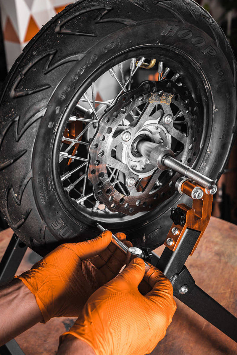✅ Uistite sa, že motocykel je stabilne umiestnený a koleso je správne demontované.