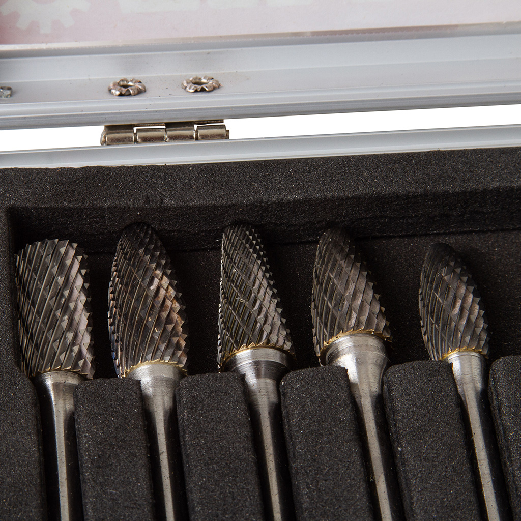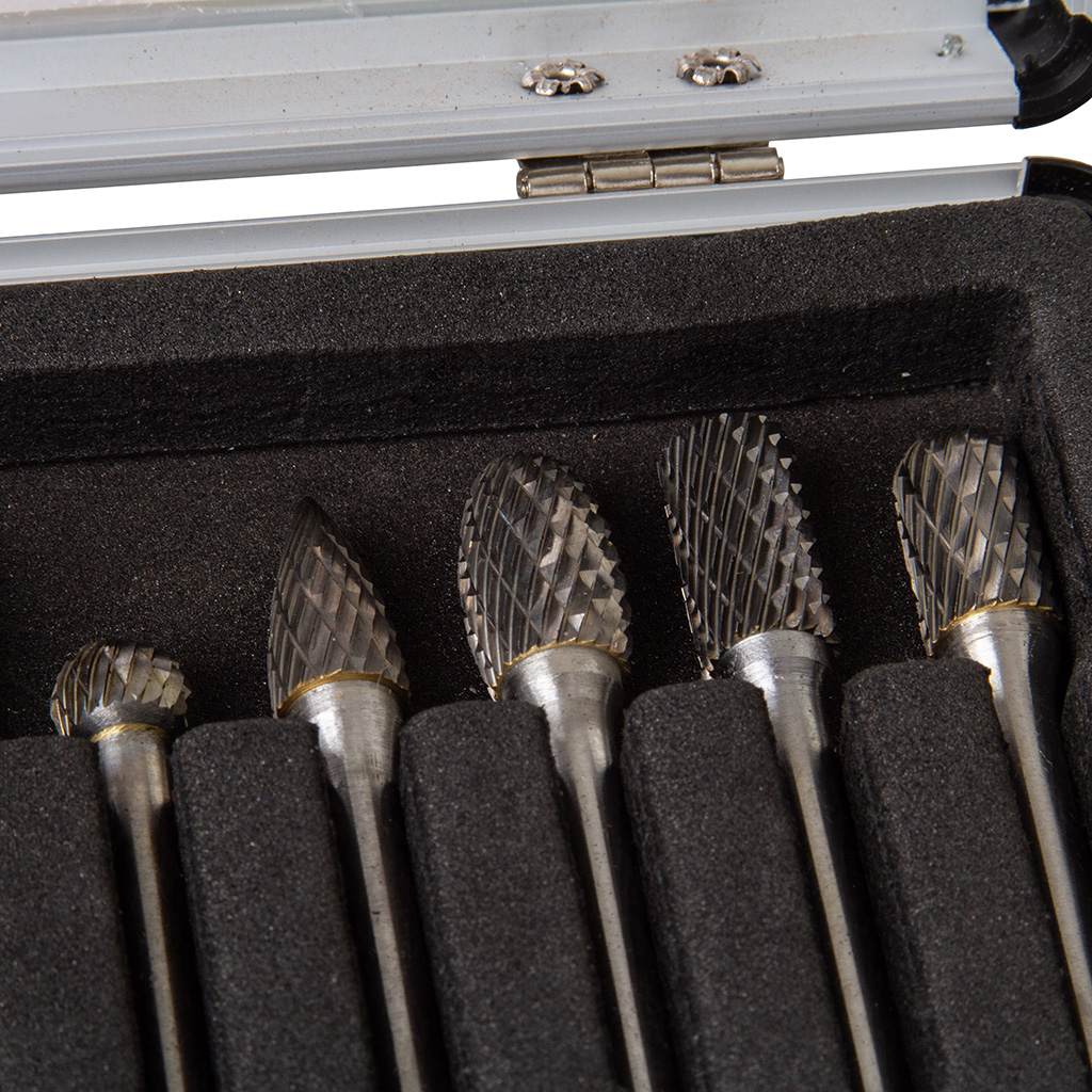 Sada stopkových fréz z volfrámu, vhodná na obrábanie kovov, dreva a plastov. Obsahuje 10 fréz s priemerom stopky 6 mm, uložených v hliníkovom kufríku.