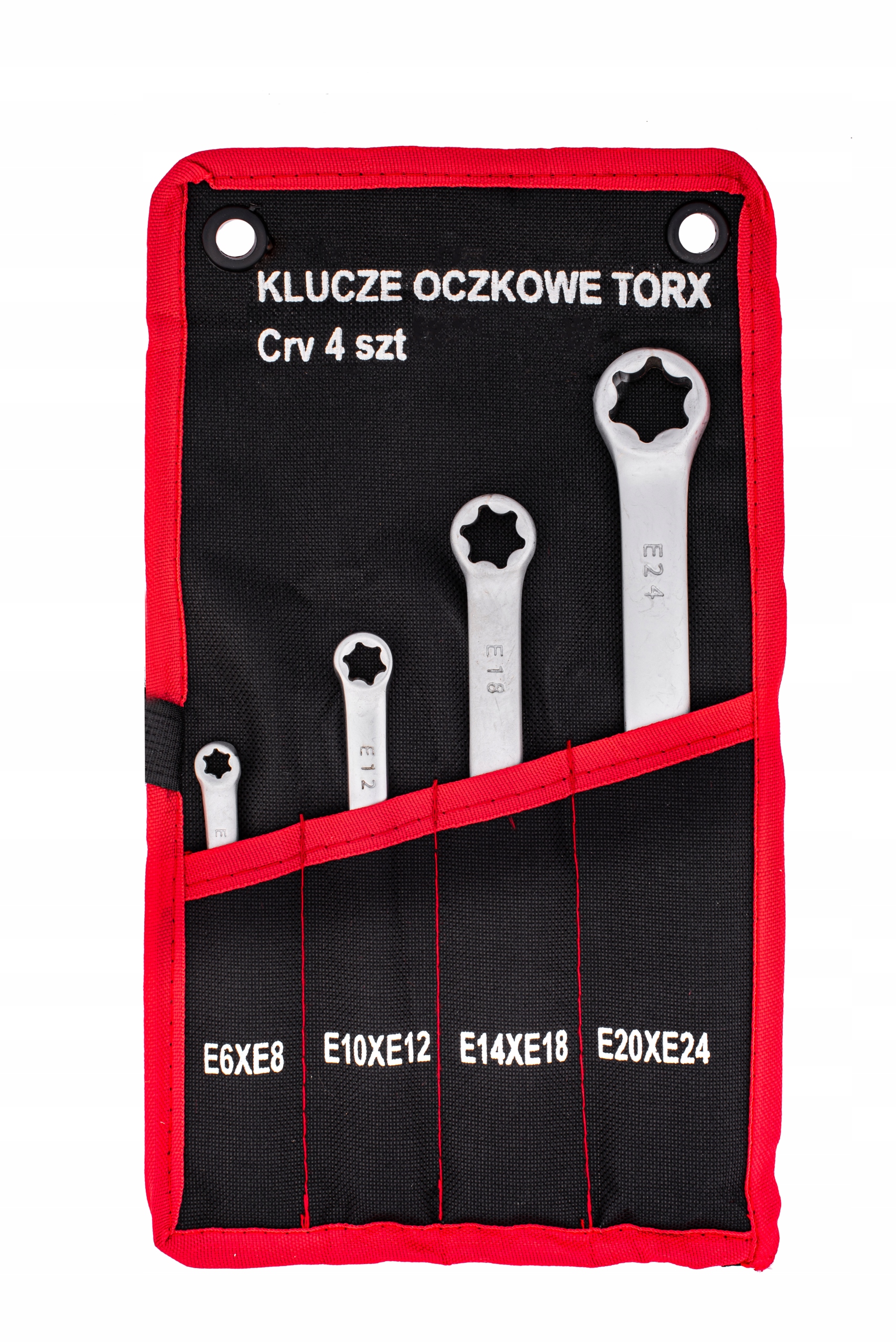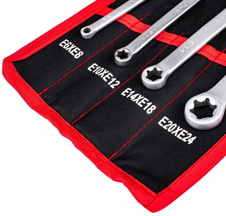 Profesionálna 4-dielna sada očkových kľúčov Torx (E6-E24) vyrobená z chróm-vanádiovej ocele. Kľúče sú uložené v praktickom nylónovom púzdre pre jednoduché premiestňovanie, uskladnenie alebo zavesenie.