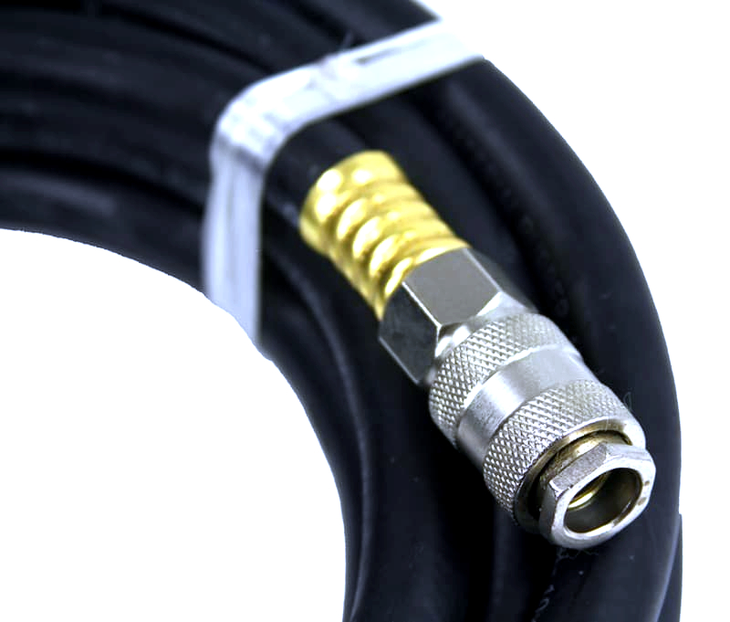 Hadica je vybavená štandardnými rýchlospojkami 1/4", čo umožňuje rýchle a jednoduché pripojenie ku kompresorom a pneumatickým zariadeniam. Vďaka pružnému gumenému materiálu sa ľahko navíja na bubon, čím sa predchádza zamotávaniu a zaisťuje dlhá životnosť.